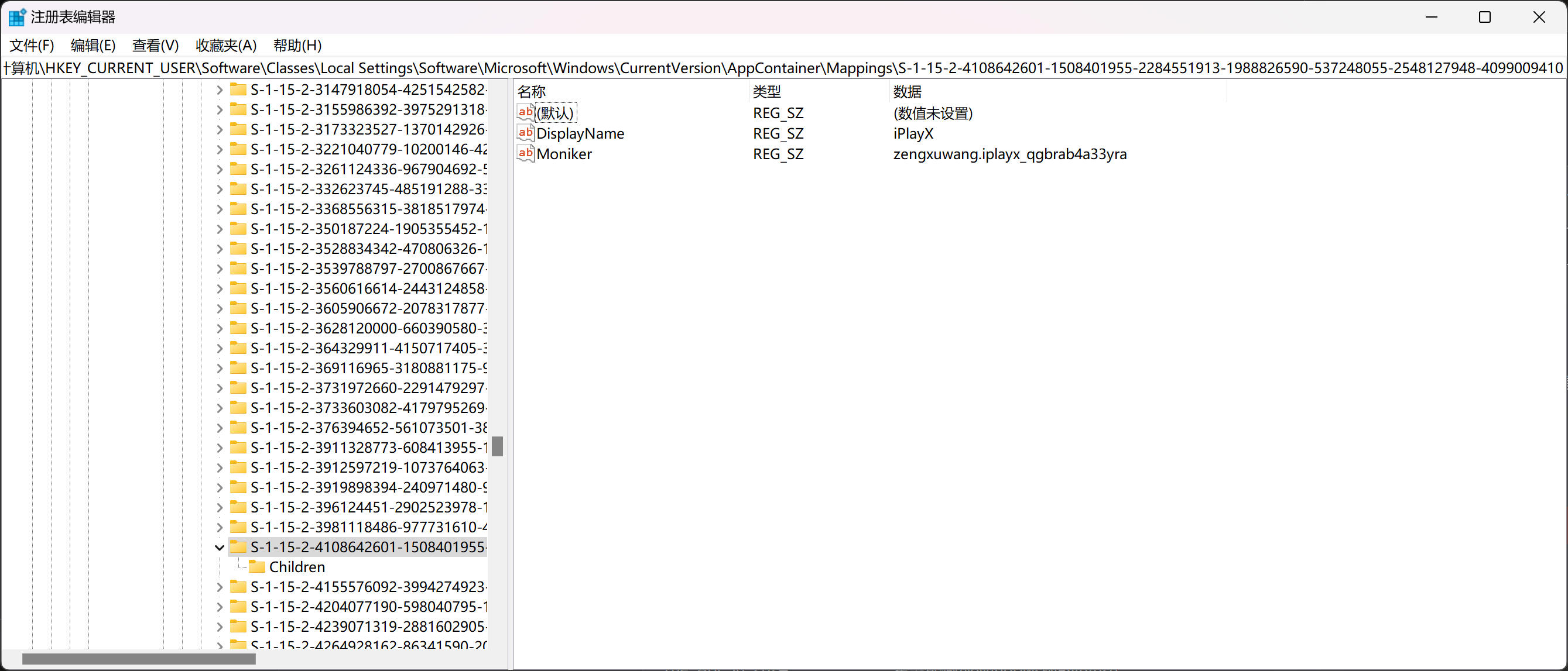 在左侧的S-1这些项,逐个点击,查看DisplayName为iPlayX的项,复制项目的名称或者地址栏最后一串S-1开头的字符串